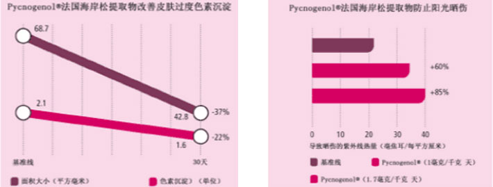 Pycnogenol®法国海岸松提取物证实,能帮助减少色素沉淀(黄褐斑点或板块),降低色素平均沉淀强度