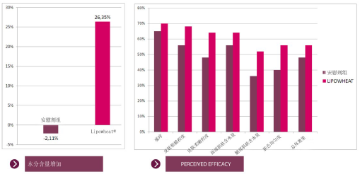 Lipowheat™ 服用组中,92%的女性肌肤含水量增加,并显著高于安慰剂服用组员。实验还显示出Lipowheat™ 对于干燥皮肤的起皮,瘙痒,粗糙和红血丝状况亦有明显改善。